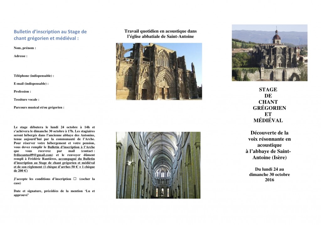 Un stage de chant grégorien et médiéval aura lieu dans l’abbaye de Saint-Antoine en Isère (38) du lundi 24 au dimanche 30 octobre 2016. Les stagiaires seront invités à (re)découvrir le chant grégorien dans ses premières notations, à le restituer à partir de sa mémoire orale et à lui redonner place dans un lieu acoustique exceptionnel comme l’abbaye de Saint-Antoine.