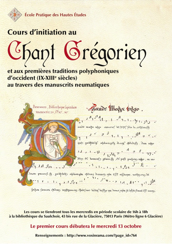 >> À la rentrée 2010/11, Frédéric Rantières ouvre un Cours d’initiation au Chant grégorien et aux premières traditions polyphoniques d’Occident (IXe – XIIIe siècles).