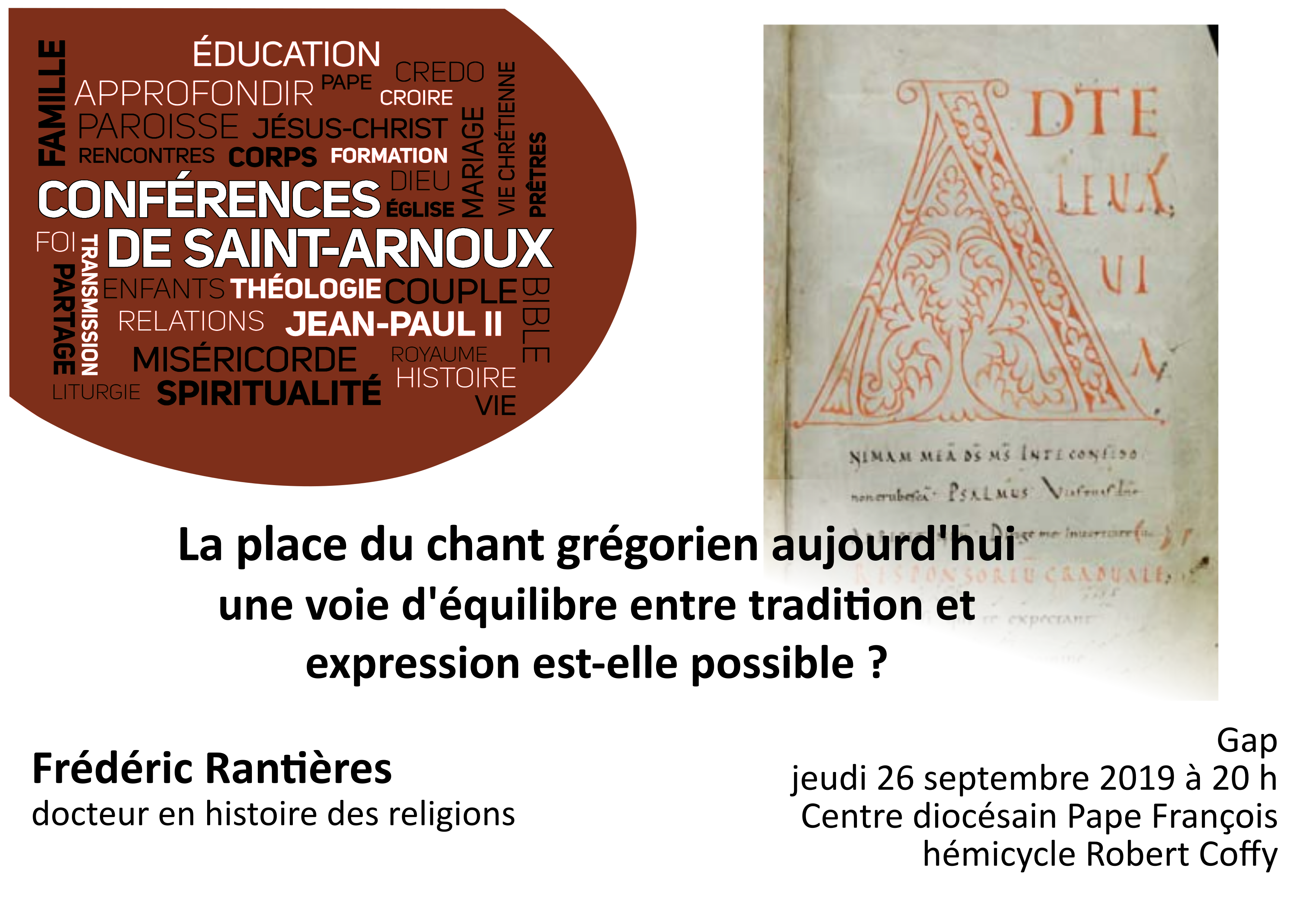 Frédéric Rantières, docteur en histoire des religions et en anthropologie religieuse, donnera une conférence intitulée « La place du chant grégorien aujourd’hui : une voie d’équilibre entre tradition et expression est-elle possible ? » le jeudi 26 septembre 2019 à 20 h au Centre diocésain pape François de Gap.