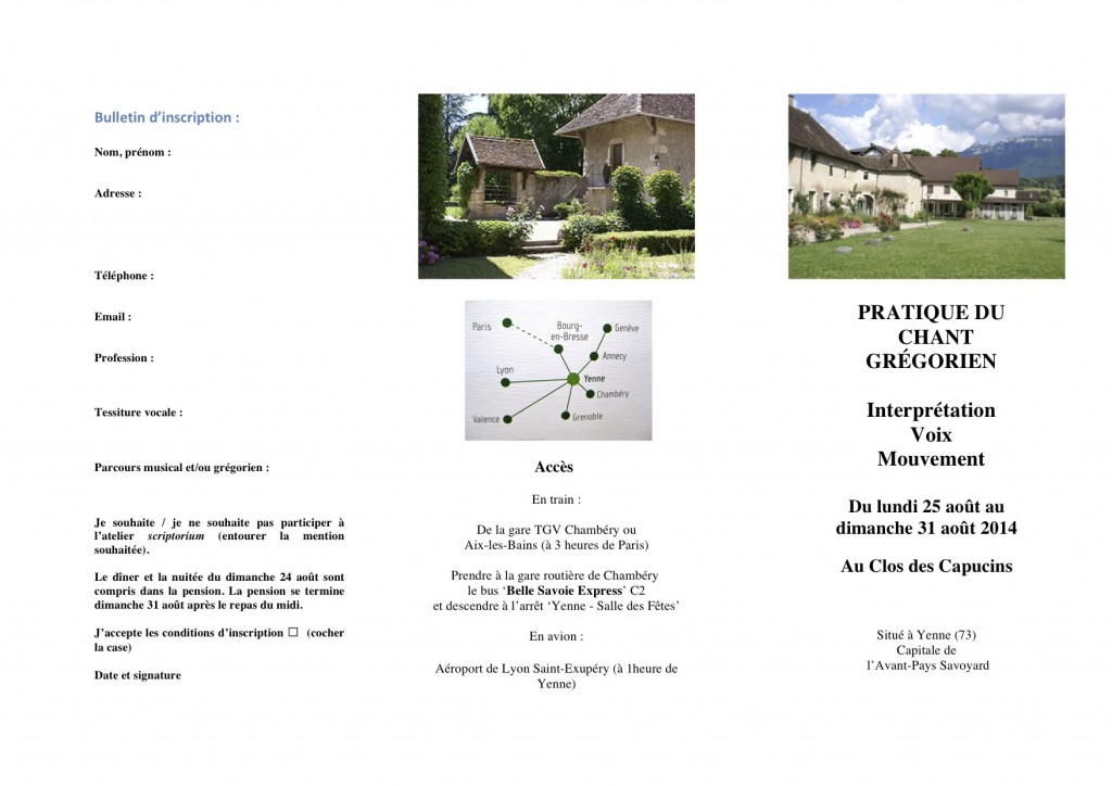 Un stage de pratique et d’interprétation du chant grégorien aura lieu du lundi 25 août au dimanche 31 août 2014 en Savoie, au Clos des Capucins. Lors de ce stage, nous aborderons la pratique et l’interprétation du chant grégorien à partir des manuscrits neumés. Un travail spécifique sera proposé sur la pose de voix et le développement de la colonne d’air dans la pratique de la psalmodie et du chant orné. En complément, des ateliers sur le geste de direction de chœur et sur l’enluminure seront proposés. Pour obtenir plus de renseignements et vous inscrire, cliquez sur la rubrique Stages. Cliquez sur le lien de l’Office de tourisme pour découvrir sur Internet Yenne et sa région.