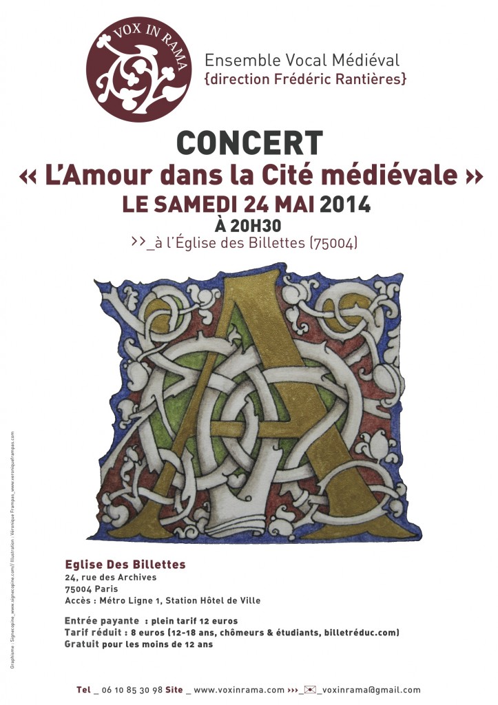 Cette année, l’ensemble Vox in Rama vous propose d’explorer l’univers sonore des motets des XIIIe et XIVe siècles avec un nouveau programme intitulé ‘L’Amour dans la Cité médiévale‘. Ce programme sera créé samedi 24 mai 2014 à 20h30 à l’église des Billettes (24, rue des Archives, métro Hôtel de Ville, ligne 1). Pour plus d’informations, allez sur le site de l’ensemble Vox In Rama.