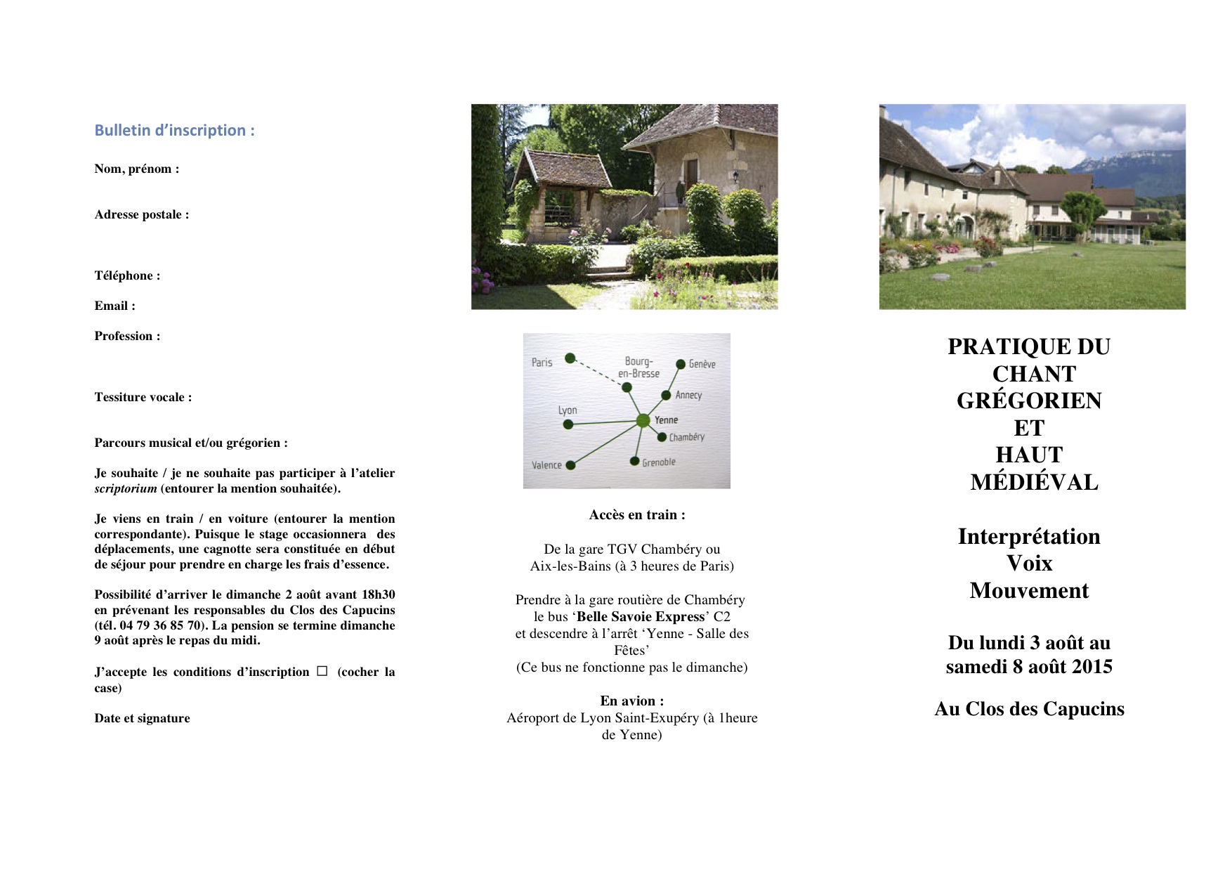 Du lundi 3 au samedi 8 août 2015 se déroulera le stage de Pratique et d’interprétation du chant grégorien et haut médiéval au Clos des Capucins, en Savoie. Les participants pourront découvrir et s’initier à l’art du chant grégorien et des premières polyphonies liturgiques à partir des premiers témoignages manuscrits sur l’oralité. Ils pourront puiser leur interprétation dans les indications de chant anciennes (neumes) qui indiquent aux chantres la manière dont ils peuvent animer leur chant et restituer ainsi toutes les subtilités qui le rendent juste et émouvant. Lors de ce stage sera proposé en ateliers un travail spécifique sur le rapport entre intention, mouvement et voix. Cette approche intéresse directement les personnes en recherche de leur voix et les transmetteurs de l’oralité (chanteurs, chefs de chœur, enseignants, pédagogues, comédiens, etc.). L’atelier Scriptorium proposera aux stagiaires intéressés de découvrir les illustrations du traité médical appelé au Moyen Âge Tacuinum sanitatis et d’illustrer un chant tiré du programme.