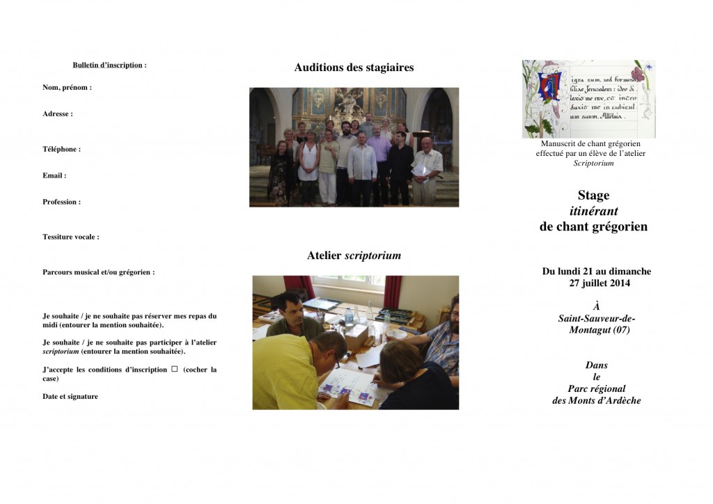 Un stage itinérant de chant grégorien et haut médiéval aura lieu du lundi 21 juillet au dimanche 27 juillet 2014 en Ardèche. Ce stage propose une initiation au chant grégorien, où nous découvrirons chaque jour un chant et prendrons le temps d’accorder nos résonances aux acoustiques des églises romanes d’Ardèche. Pour plus de renseignements, cliquez sur la page Stages.